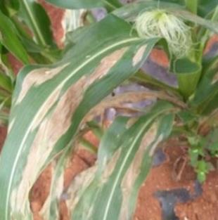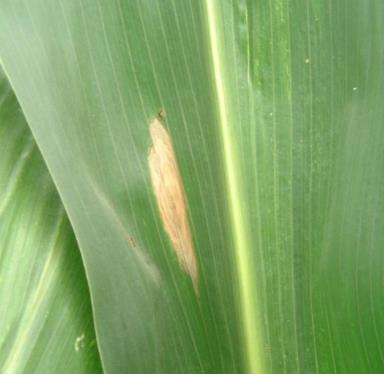 此病主要危害玉米葉片并逐步侵入到葉鞘與包葉。小病斑逐漸沿葉脈擴大,形成長梭形,大小不等的萎蔫斑。后期變為青褐色或黃褐色。葉上病斑多時,常相互連接成不規則形大斑,引起葉片早枯。